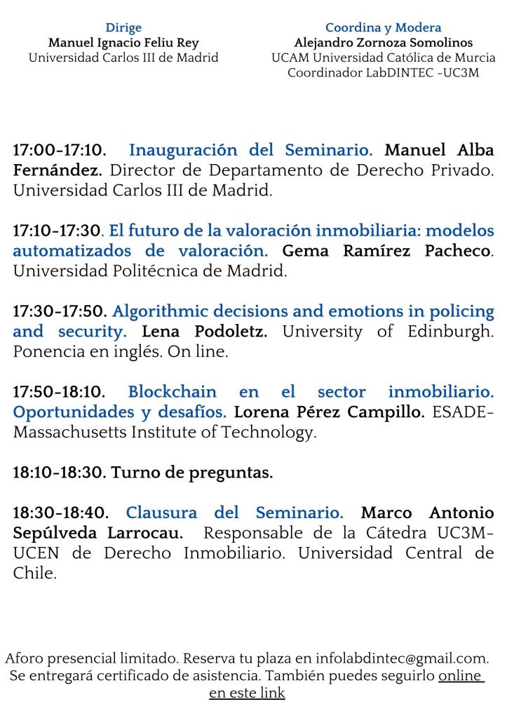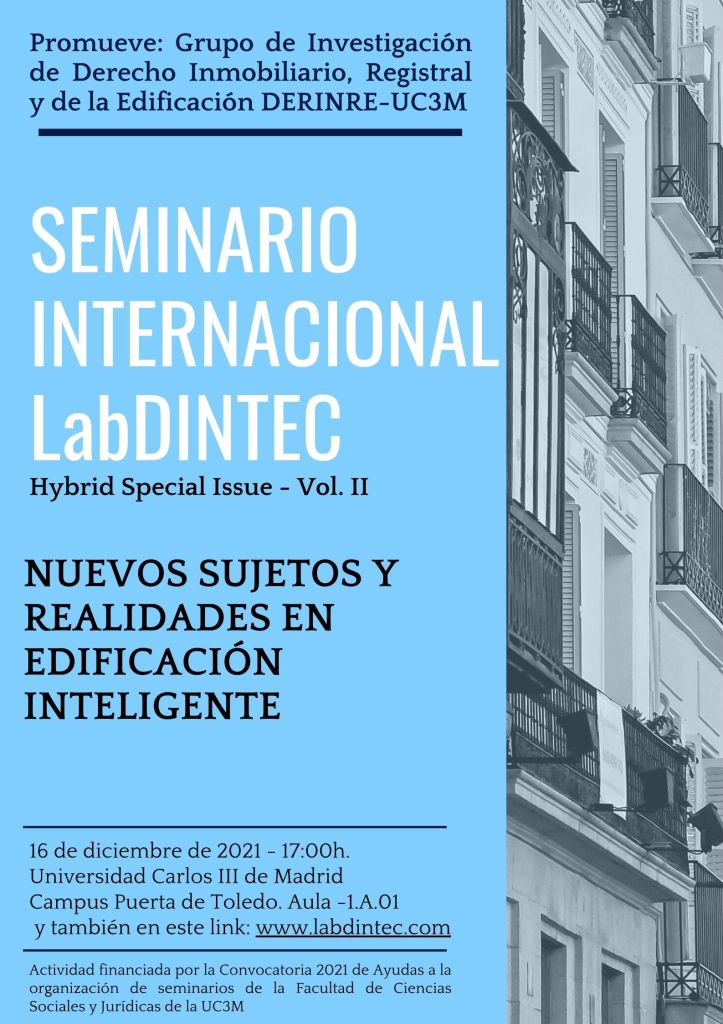 El próximo 16 de diciembre de 2021, a las 17:00h (UTC+1), tendrá lugar la segunda edición del Seminario Internacional LabDINTEC, en esta ocasión, en torno a nuevos sujetos y realidades en edificación inteligente. El seminario se celebrará en formato híbrido, pudiendo seguirse tanto en vivo, desde el Campus de Puerta de Toledo de la Universidad Carlos III de Madrid, como en directo, a través del enlace que encontraréis más abajo. Recordad que el aforo presencial es limitado, por lo que os recomendamos reservar ya vuestra plaza en el correo infolabdintec@gmail.com. Tras la celebración del Seminario, se entregará certificado de asistencia a quien lo solicite.